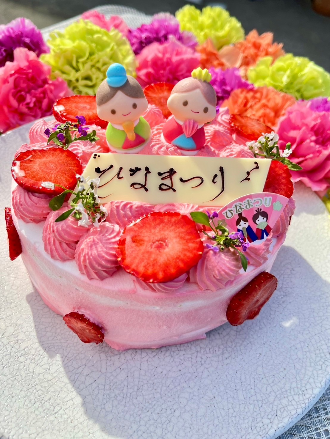 桃の節句にちなみ、今年のひなまつりデコレーションはケーキの上はピンク色の絞りで可愛いく仕上げました。